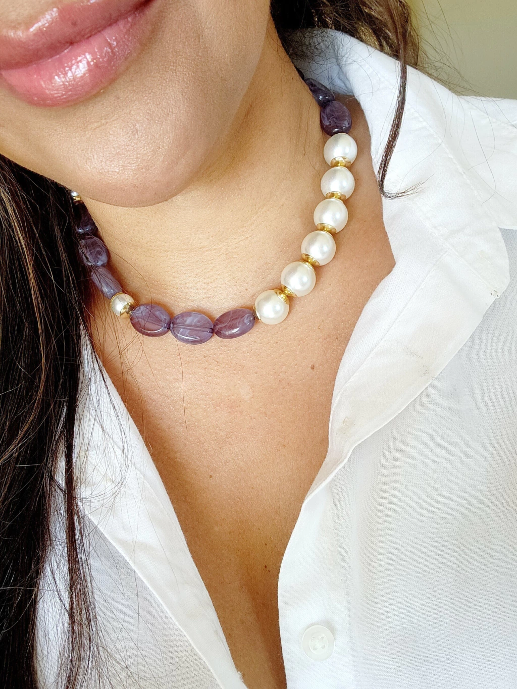O conjunto traz sofisticação em uma composição harmoniosa entre colar e brincos. O colar é formado por contas ovais em tom roxo translúcido, intercaladas com esferas peroladas e pequenos detalhes metálicos dourados, criando um contraste refinado entre cores e texturas.